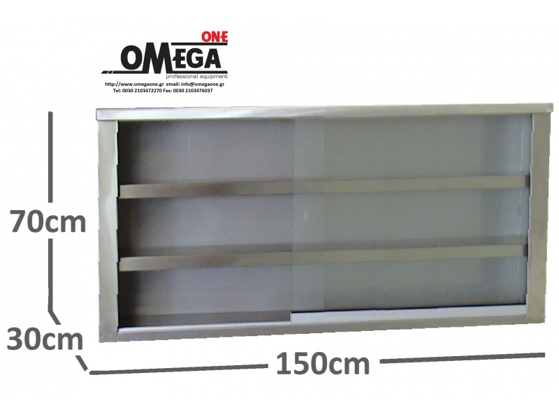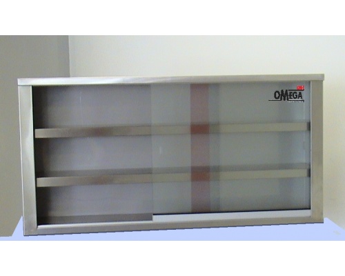 Stainless steel sliding door wall cupboard. Available with sliding glass doors and 2 fixed shelves